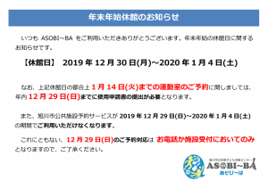 また、旭川市公共施設予約サービスが2019年12月29日(日)〜2020年1月4日(土)の期間でご利用いただけなくなります。